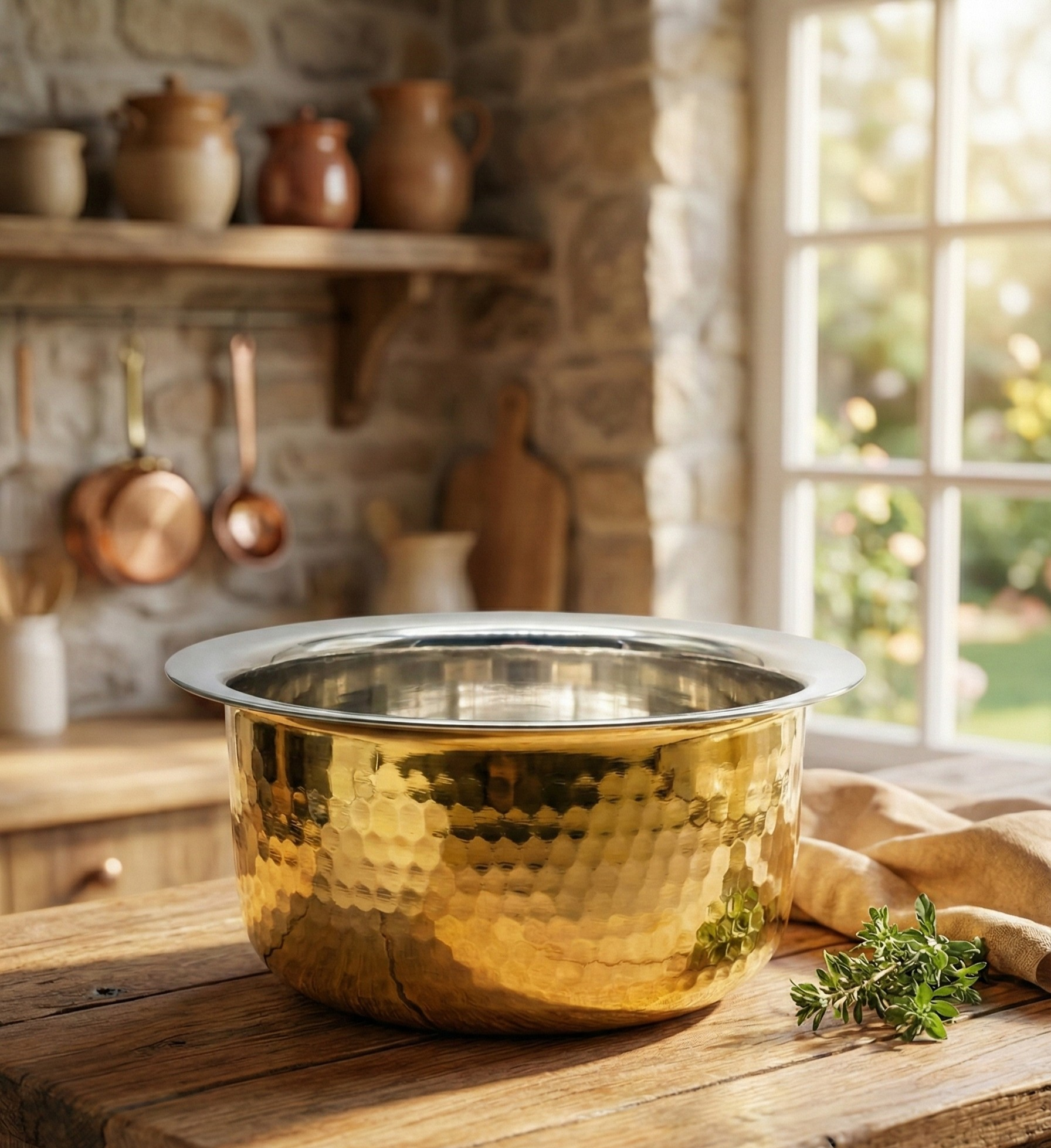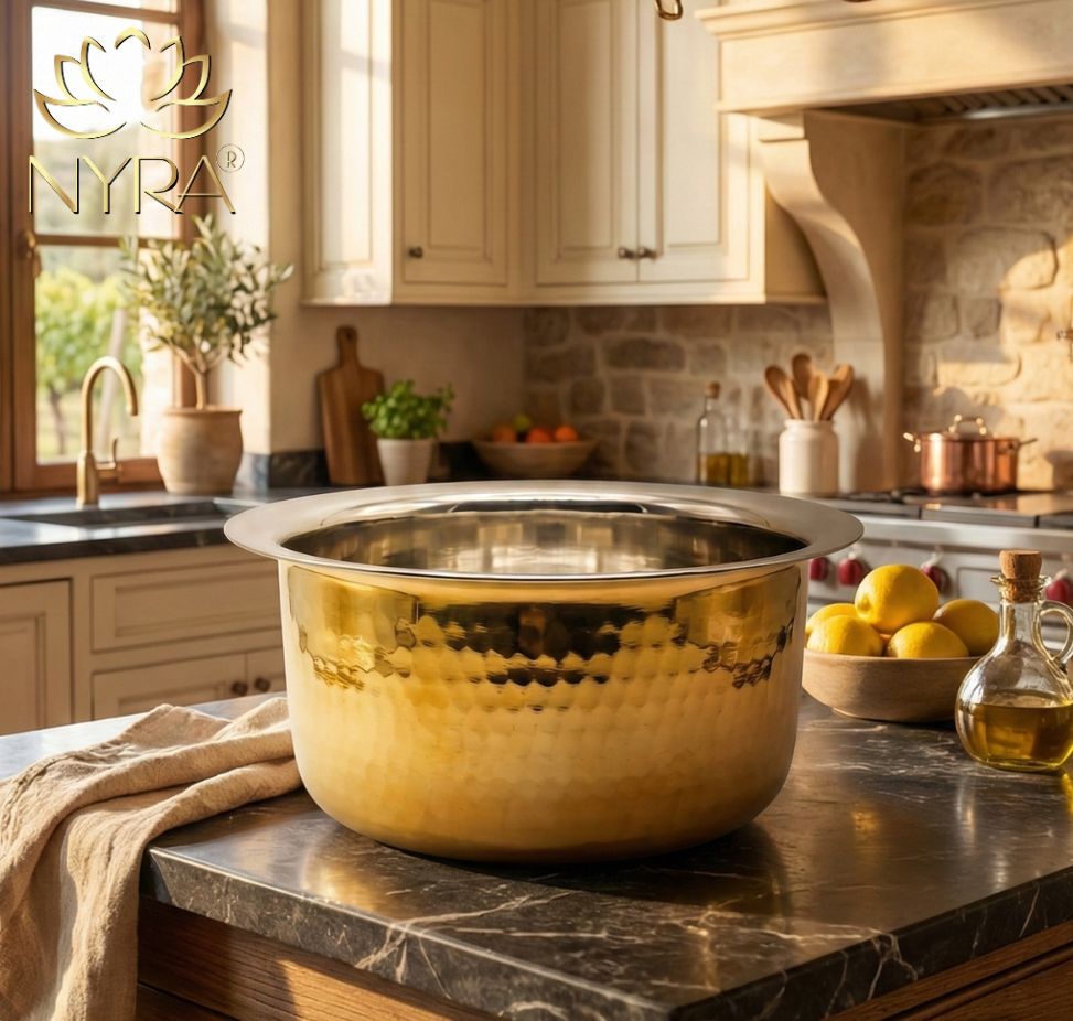 Nyra® presents a premium quality Pure Brass Kalai Tope/Patila/Bhagona, crafted with a heavy Peetal gauge and Kalai (Tin) coating inside, ensuring durability and optimal performance in your kitchen. The collar rim provides ease of handling, while the multiple size options make it perfect for various cooking needs. This gas stove-friendly tope ensures even heat distribution, promoting faster boiling and superior cooking results. Ideal for preparing and storing dishes like vegetable curries, dal, biryani, milk, and other authentic Indian meals, it retains food freshness and enhances taste. The combination of brass and Kalai coating ensures that the tope is food-safe, durable, and easy to clean, making it perfect for everyday use. Whether you're stirring, sautéing, or storing, this tope delivers an elegant dining experience and becomes an essential piece for your kitchen and dining table.