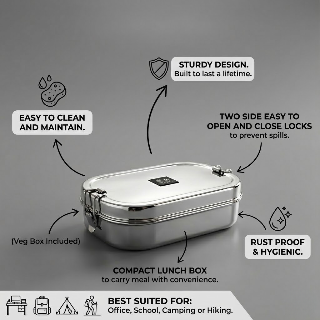 Stainless Steel Rectangular Lunch Box | Leak-Proof Tiffin with Inner Container & Locking Clip
