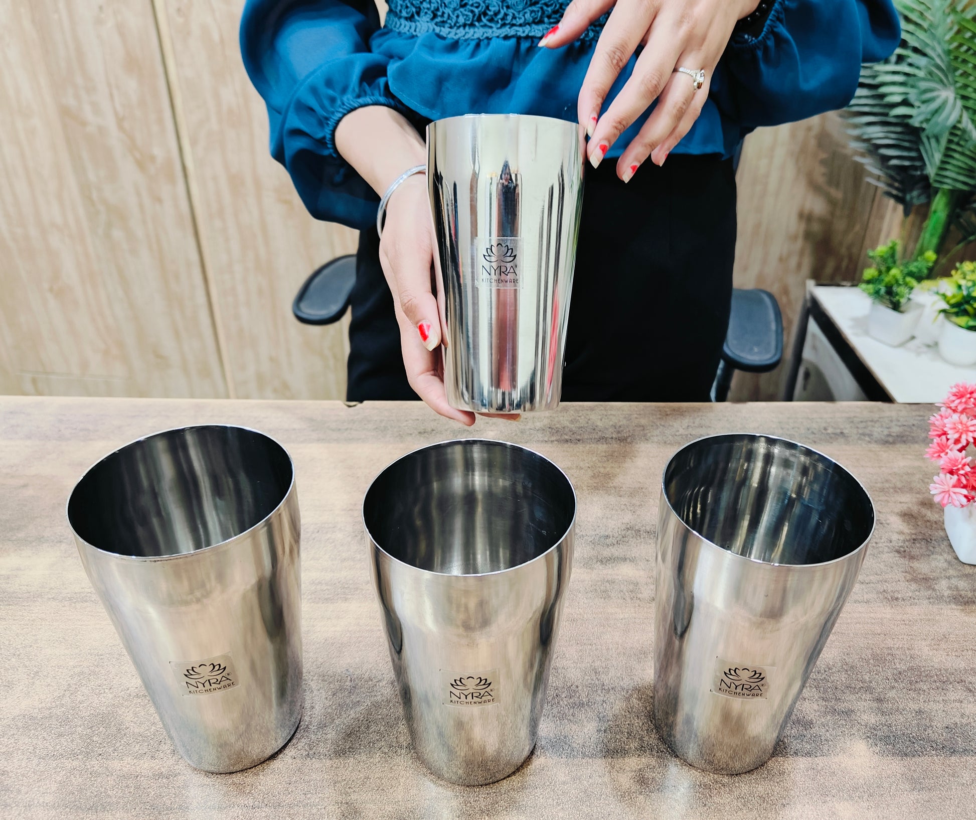 Add a touch of elegance to your dining experience with the Nyra Stainless Steel Lassi Glass Set. With a generous 650 ML capacity per glass, this set is perfect for serving lassi, shakes, lemonade, water, juice, and other beverages. Available in sets of 2, 4, and 6 pieces, these glasses are designed to bring style and sophistication to your home, hotel, or restaurant.