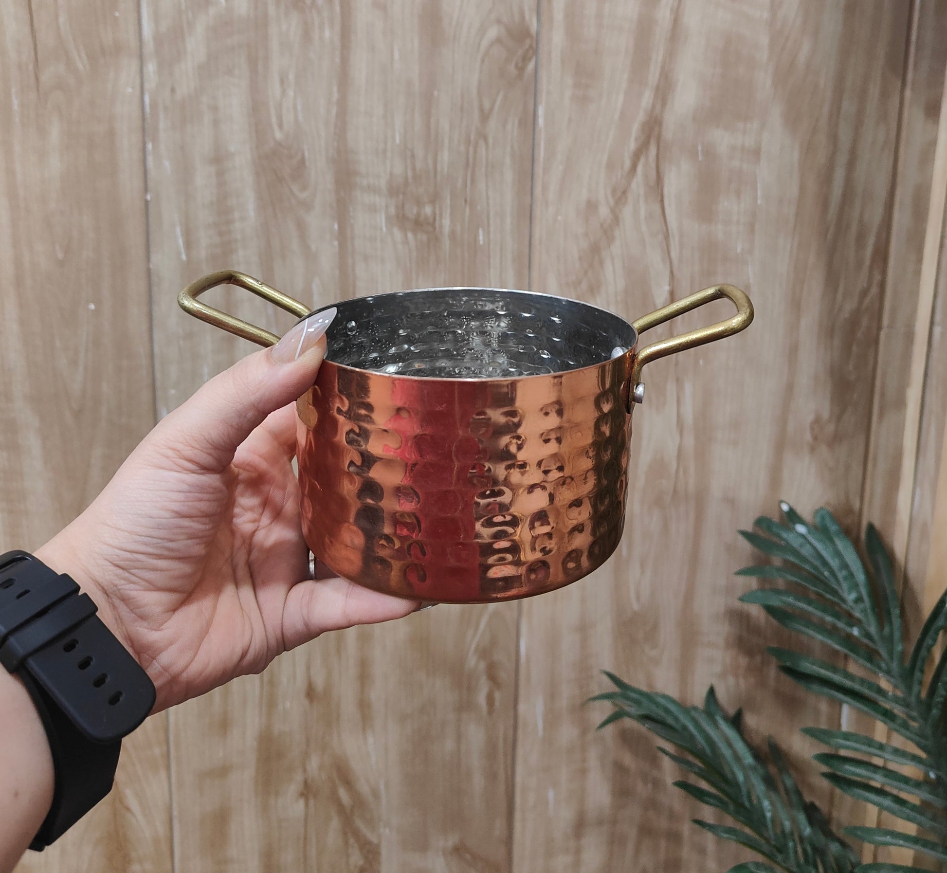 Bring tradition to your table with Nyra Stainless Steel Rose Gold Finish. Made with a copper-colored PVD outer body and a high-grade stainless steel inner surface, this handi is perfect for serving dal, sabzi, gravies, and biryani at home or in restaurants. The hammered texture gives it a premium, traditional Indian look that adds elegance to your dining experience. Strong dual brass handles ensure easy carrying and serving.