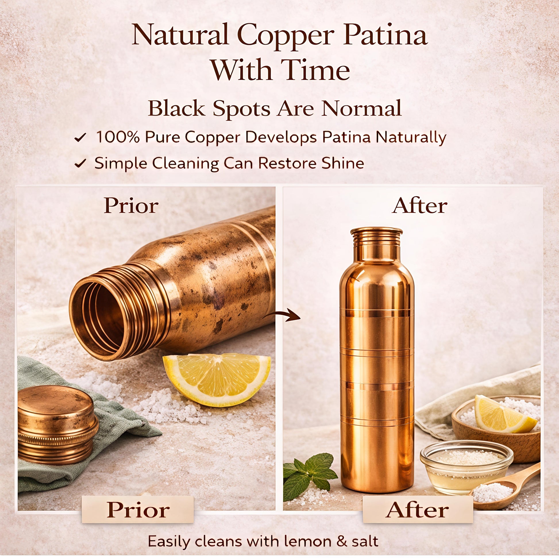 • Lemon & Salt Method – For natural shine, clean with lemon juice (or vinegar) mixed with salt, rinse well, and dry immediately.