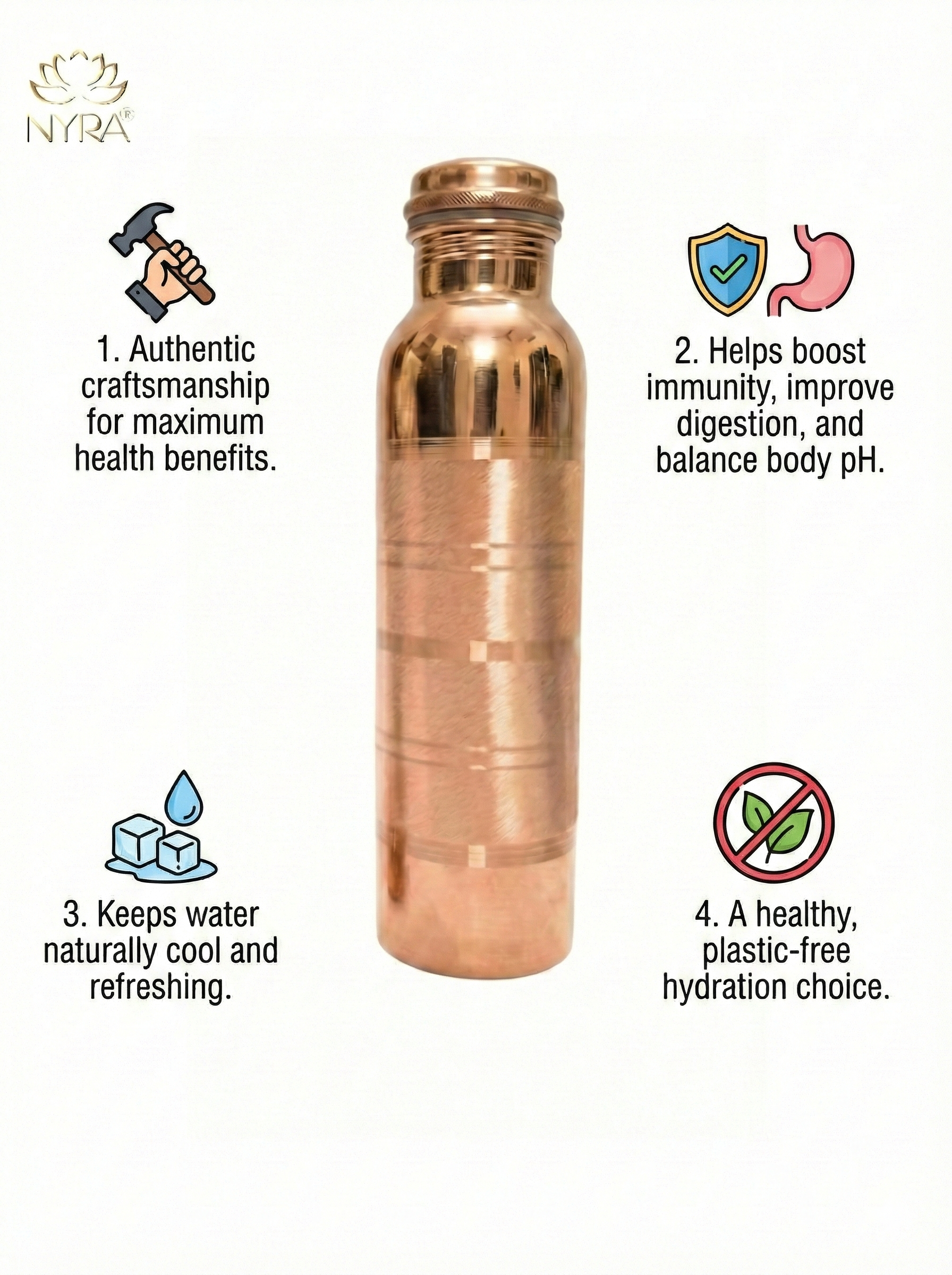 Nyra® Pure Copper Water Bottle is designed to bring traditional Indian wisdom into modern everyday living. Crafted from 100% food-grade copper, this bottle is ideal for storing drinking water at home, office, or during yoga and meditation practices.