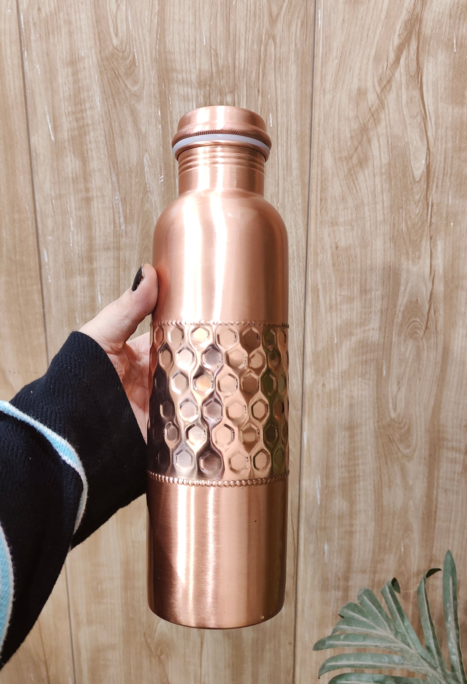 This premium Nyra hammered copper bottle is handcrafted from 100% pure copper to bring traditional Ayurvedic “tamra jal” wellness into your everyday hydration. The unique honeycomb hammering band not only looks luxurious but also provides a secure, non-slip grip, while the natural thermal properties of copper keep water pleasantly cool for hours.​